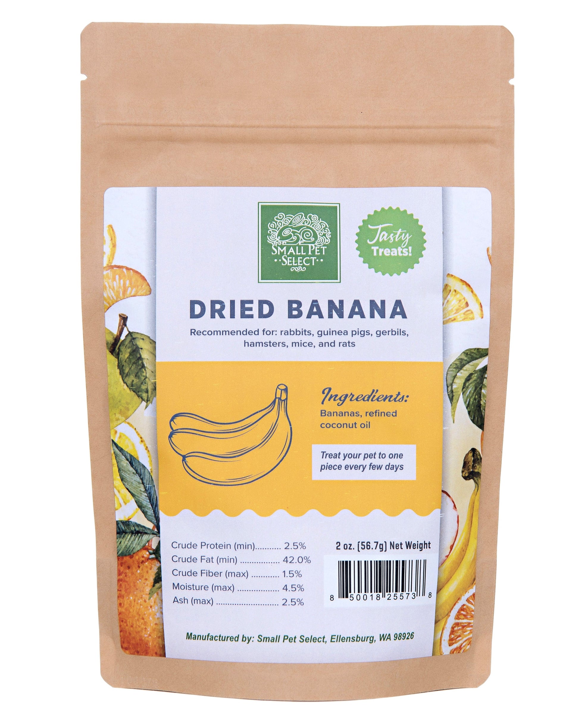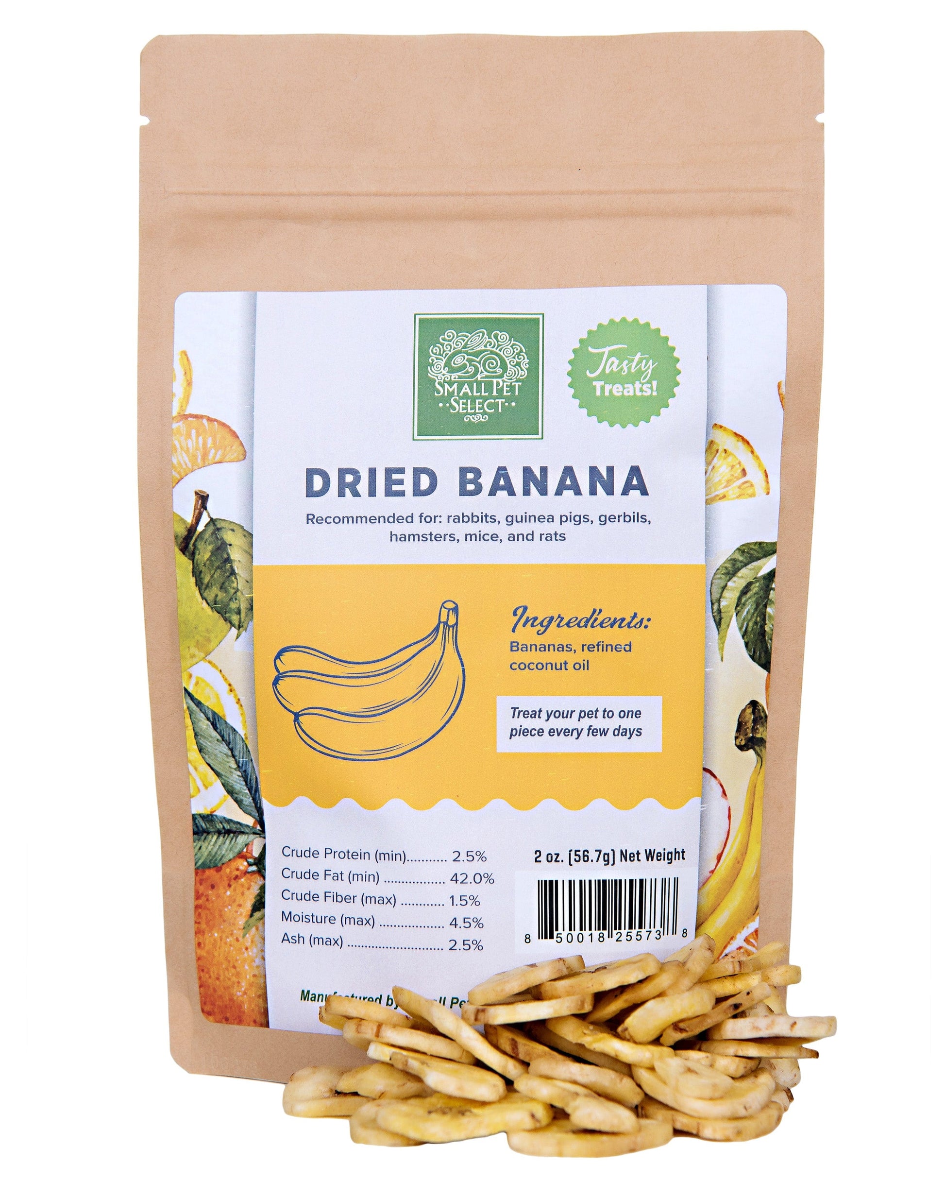 Small Pet Select’s unsweetened banana chips are delicately cooked in coconut oil for a 100% all natural treat. A great treat for rabbits, guinea pigs, gerbils, hamsters, mice and rats, No pesticides or other yucky chemicals here)