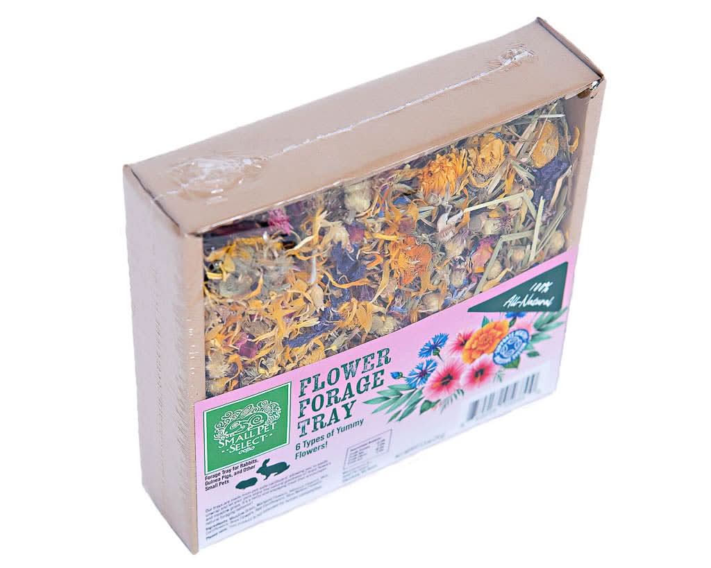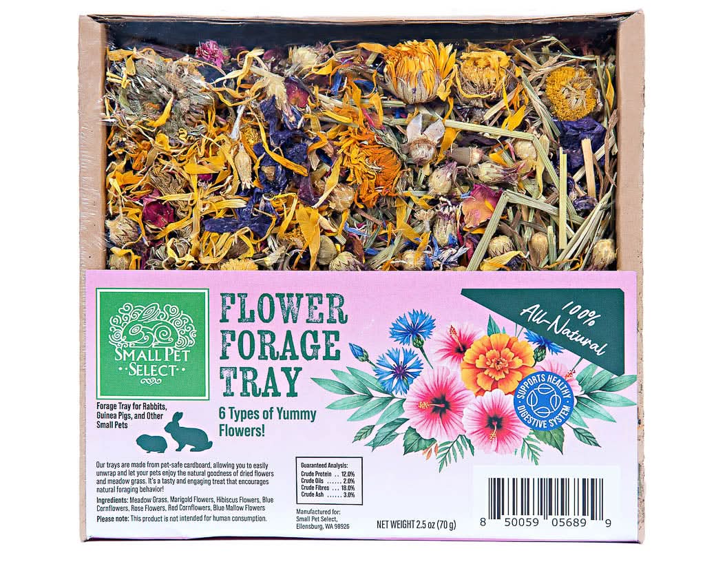 Small Pet Select Flower Forage Trays contain grazing grass which makes a fantastic addition to your rabbit's diet, the crunchy stems are great for maintaining tooth health and the high-fiber content is great for supporting a healthy digestive system. Our flower foraging tray is topped with a fantastic selection of fragrant marigold flowers, hibiscus flowers, rose flowers and blue mallow flowers. This aromatic blend is sure to be a favorite amongst your buns.