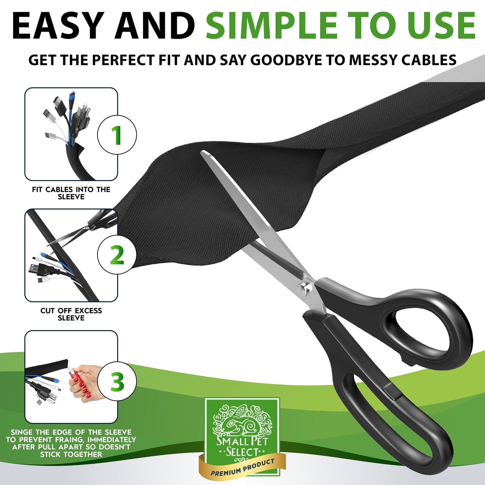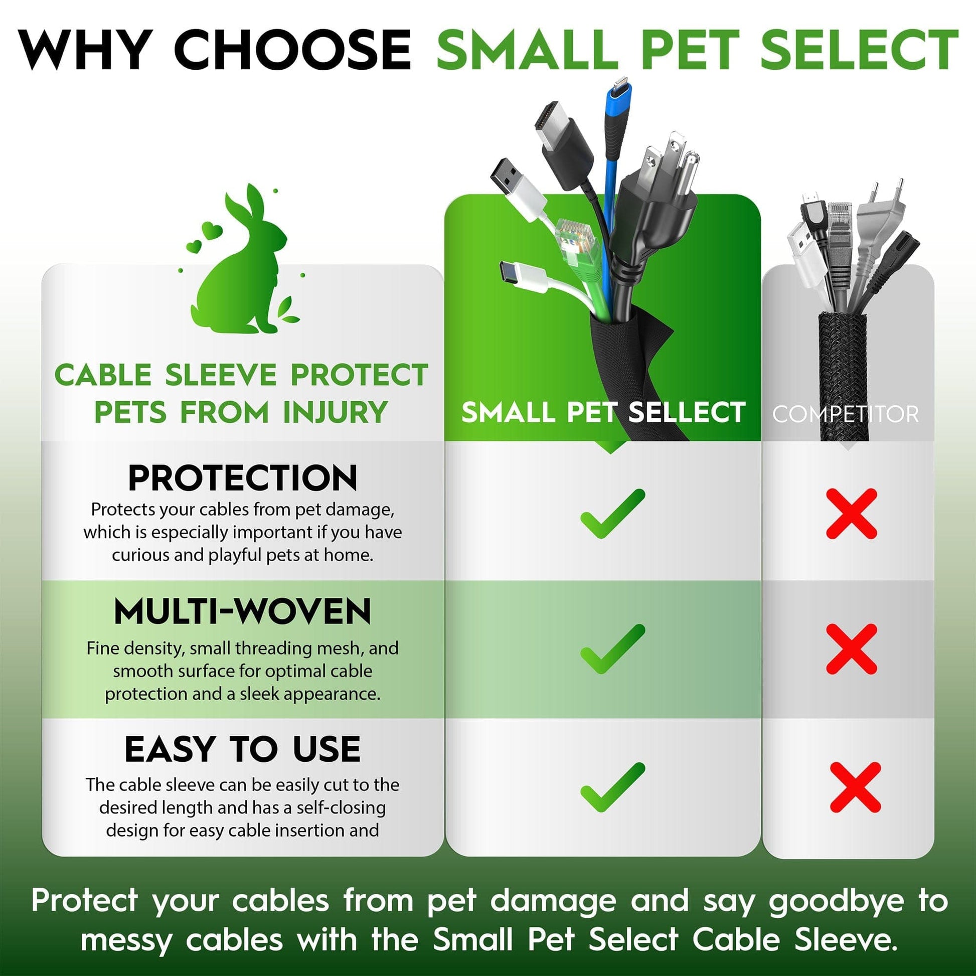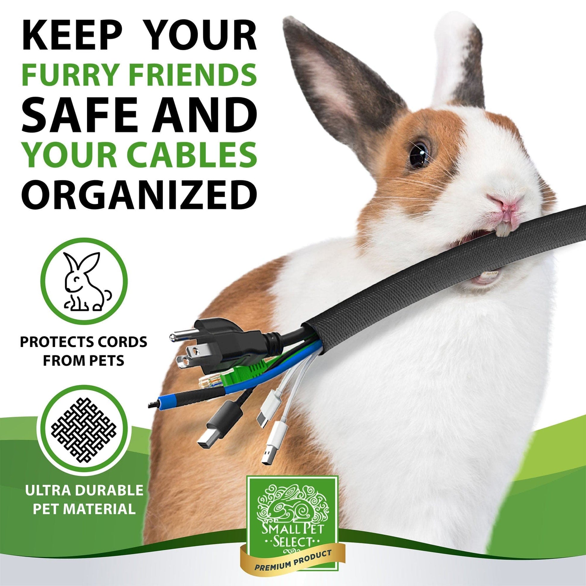 We love our pets, but we also know that they get into everything. The natural urge rabbits, guinea pigs and other small animals have to chew on grasses and sticks in the wild can get them in trouble when they find exposed wires and power cords in the home. After years of using ugly, bulky, hard to use cable protectors and replacing far too many device chargers, we knew pet owners needed something better. That's why we designed the Small Pet Select Heavy Duty Cord Cover. It's designed with an ultra strong, durable PET material with a low-profile woven texture. The non-toxic material is safe for animals and is waterproof for indoor and outdoor use. It features a handy wrapper style that expands to fit up to six cables.The wire protector tubing keeps your home organized and is compatible with a variety of cords such as computer cables, power cords, extension cords, and can even be used to conceal wall mounted tv connections. The flexible 10 ft cord cover can easily be trimmed to meet all of your power cable protection needs. So whether you are working with a bored cat or puppy proofing for a teething dog, you can keep both them and your devices safe from damage.